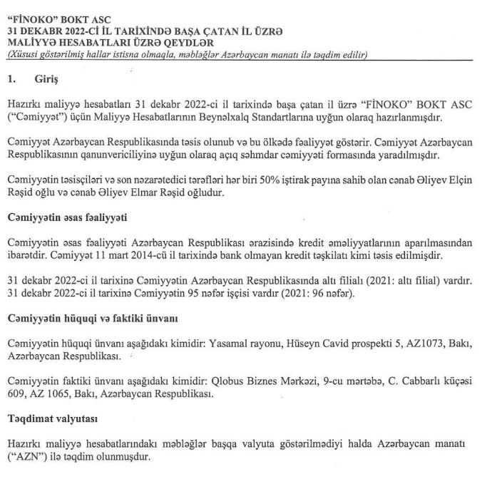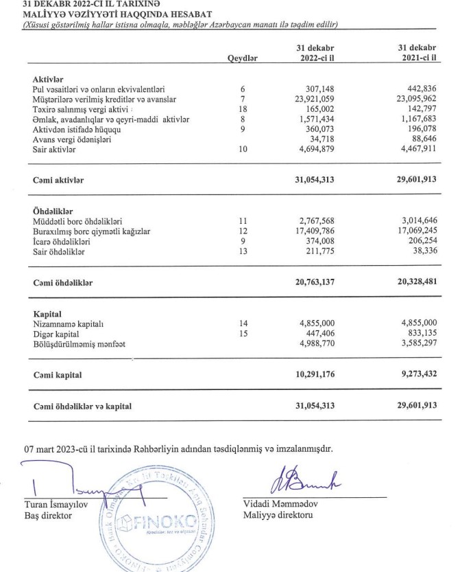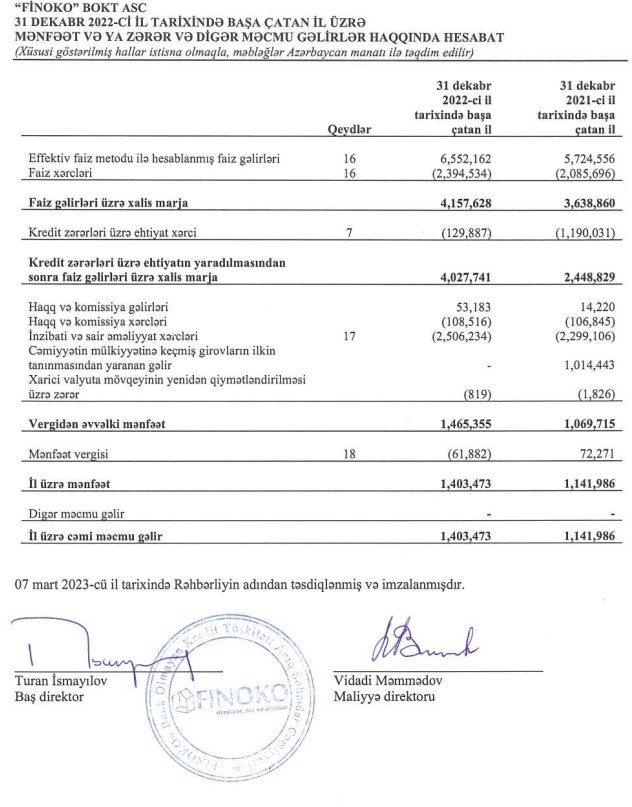 "FİNOKO" Bank Olmayan Kredit təşkilatı Açıq Səhmdar Cəmiyyəti 2022-ci ili 1 milyon 404 min manat xalis mənfəət ilə başa vurub. Təşkilat 2021-ci ili 1 milyon 142 min manat xalis mənfəət ilə bağlamışdı.