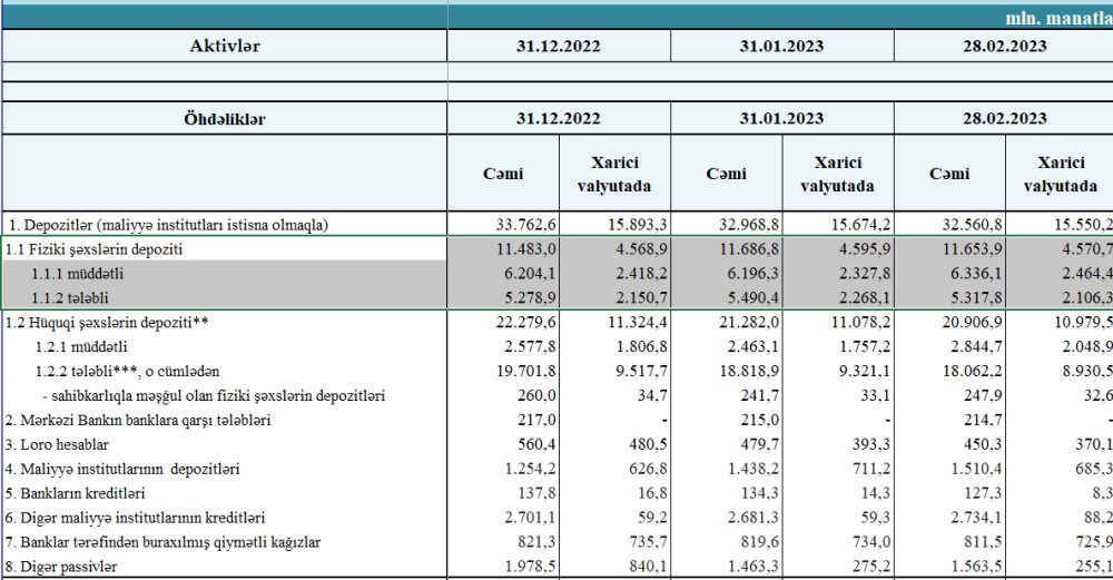 Fevral ayında fiziki şəxslərin cəmi əmanətləri (müddətli və tələbli) 32 milyon 831 min manat azalaraq 11 milyard 653 milyon 924 min manata geiləyib (yanvarın sonunda 11 milyard 686 milyon 755 min manata çatmışdı). Azlama fiziki şəxslərin tələbli əmanətlərinin azalması ilə bağlıdır. Belə ki, 2023-cü ilin yanvar ayının sonu ilə müqayisədə fevral ayında əhalinin banklardakı tələbli əmanətləri 172 milyon 601 min manat azalaraq 5 milyard 317 milyon 842 min manata düşüb.