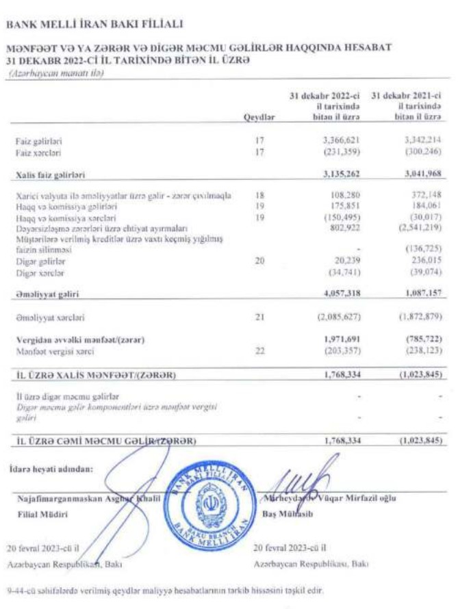 Bank Melli İran Bakı filialı 2021-ci ili 1 milyon 24 min manat xalis zərər ilə bağlamışdı. Xalis zərər Bankın ehtiyata atyırma etməsi ilə əlaqədar idi.