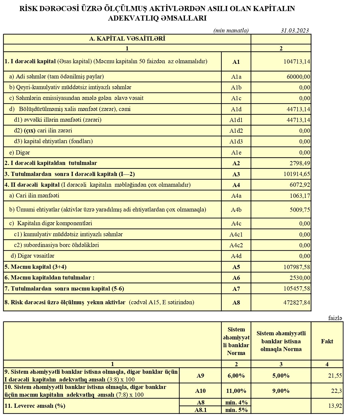 31 Mart 2023-cü il tarixində "Azərbaycan Sənaye Bankı" 105 milyon 458 min manat məcmu kapitala malik olub.