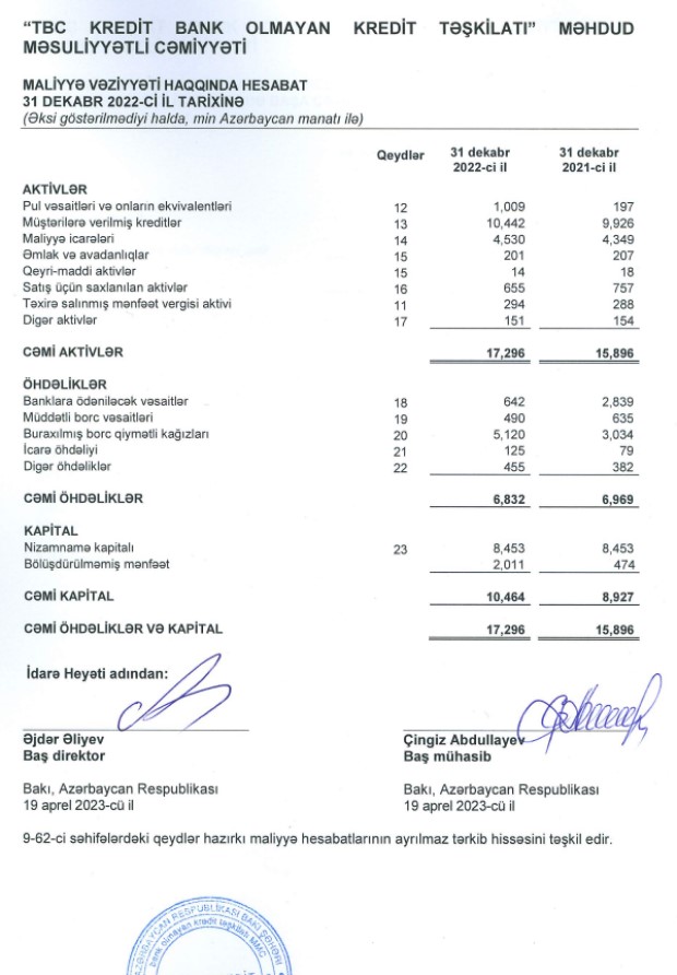 "TBC Kredit Bank Olmayan Kredit Təşkilatı" MMC 2022-ci ili 1 milyon 537 min manat xalis mənfəət ilə başa vurub. Təşkilat 2021-ci ili 979 min manat xalis mənfəət ilə bağlamışdı. Beləliklə, "TBC Kredit"in xalis mənfəəti 2021-ci illə müqayisədə 2022-ci ildə 558 min manat və ya 58% artıb.
