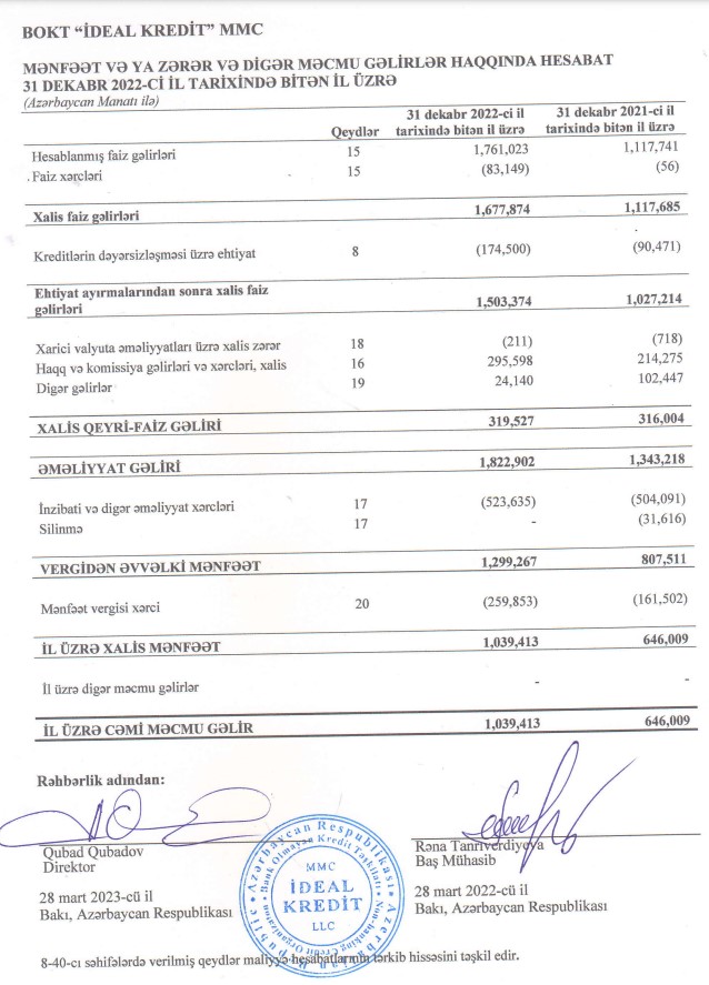 Marja.az xəbər verir ki, "İdeal Kredit"in faiz gəlirləri 2021-ci ildə 1 miylon 118 min manat ikən, 2022-ci ildə 1 milyon 761 min manat təşkil edib (644 min manat artıb). Təşkilatın haqq və komissiya gəlirləri isə 214 min manatdan 295 min manata yüksəlib.