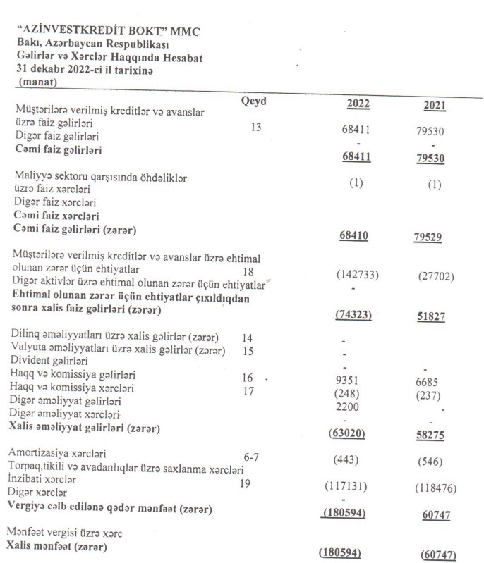 Marja xəbər verir ki, 2021-ci ildə "Azinvestkredit BOKT" faiz gəlirləri 79 min 530 manat ikən, 2022-ci ildə 68 min 411 manata düşüb (11 min 119 manat və ya 14% azalıb).