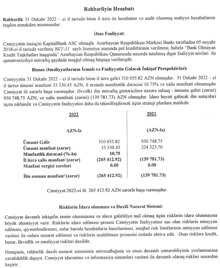 "BirKart BOKT" MMC 2022-ci il üzrə maliyyə göstəricilərini açıqlayıb.