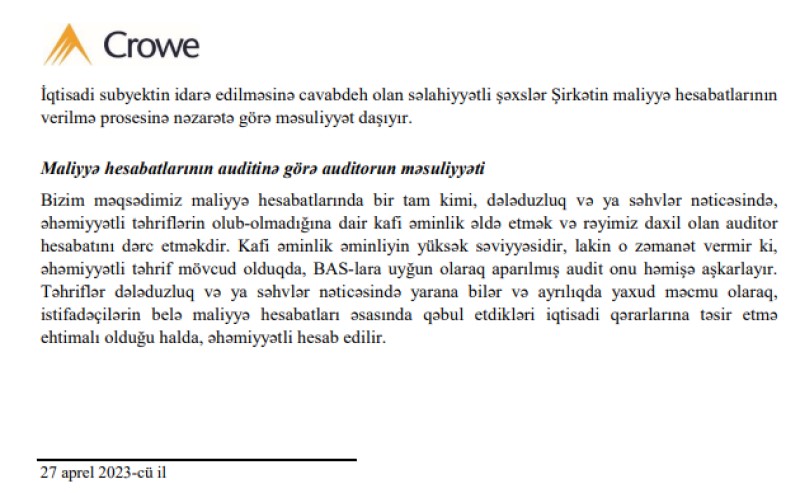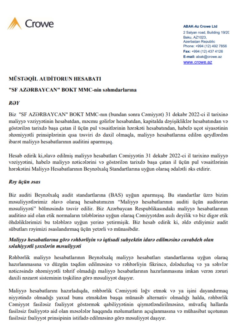 "SF Azərbaycan" BOKT MMC-nin 31 Dekabr 2022-ci il tarixinə maliyyə hesabatları və Müstəqil auditorun rəyi