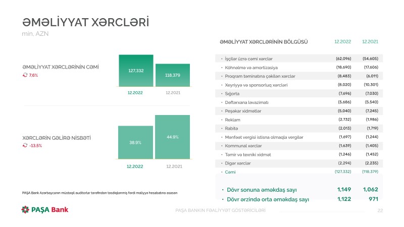 2022-ci ildə "PAŞA Bank" ASC-nin işçilər üzrə cəmi xərcləri 7 milyon 491 min manat artaraq 62 milyon 96 min manat təşkil edib.