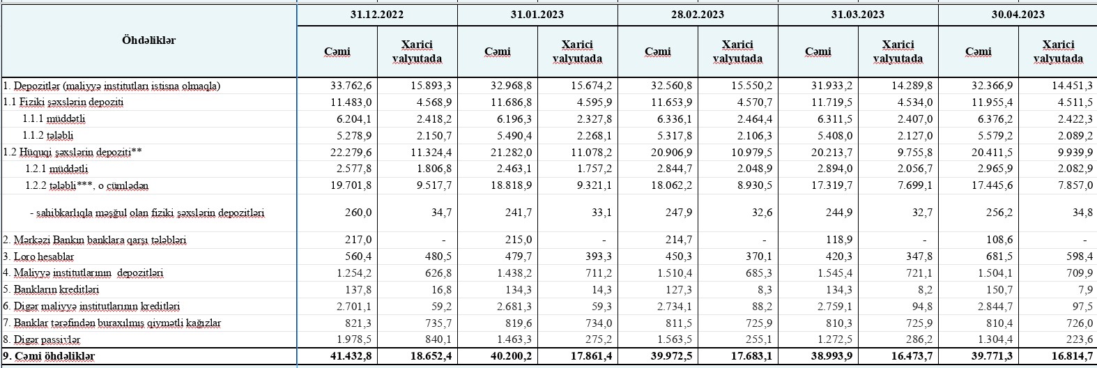 Öhdəliklərin strukturunda depozit portfeli üstünlük təşkil edir (cəmi öhdəliklərin 81.4%-i və ya 32 milyard 366.9 milyon manat). Bankların depozit portfeli cari ilin aprel ayında 1.4% və ya 433.7 milyon manat artmışdır. Depozit portfelinin 63.1%-i (20 milyard 411.5 milyon manat) hüquqi şəxslərin, 36.9%-i (11 milyard 955.4 milyon manat) fiziki şəxslərin depozitlərindən (fərdi sahibkarlıqla məşğul olan fiziki şəxslərin depozitləri istisna olmaqla) ibarətdir.