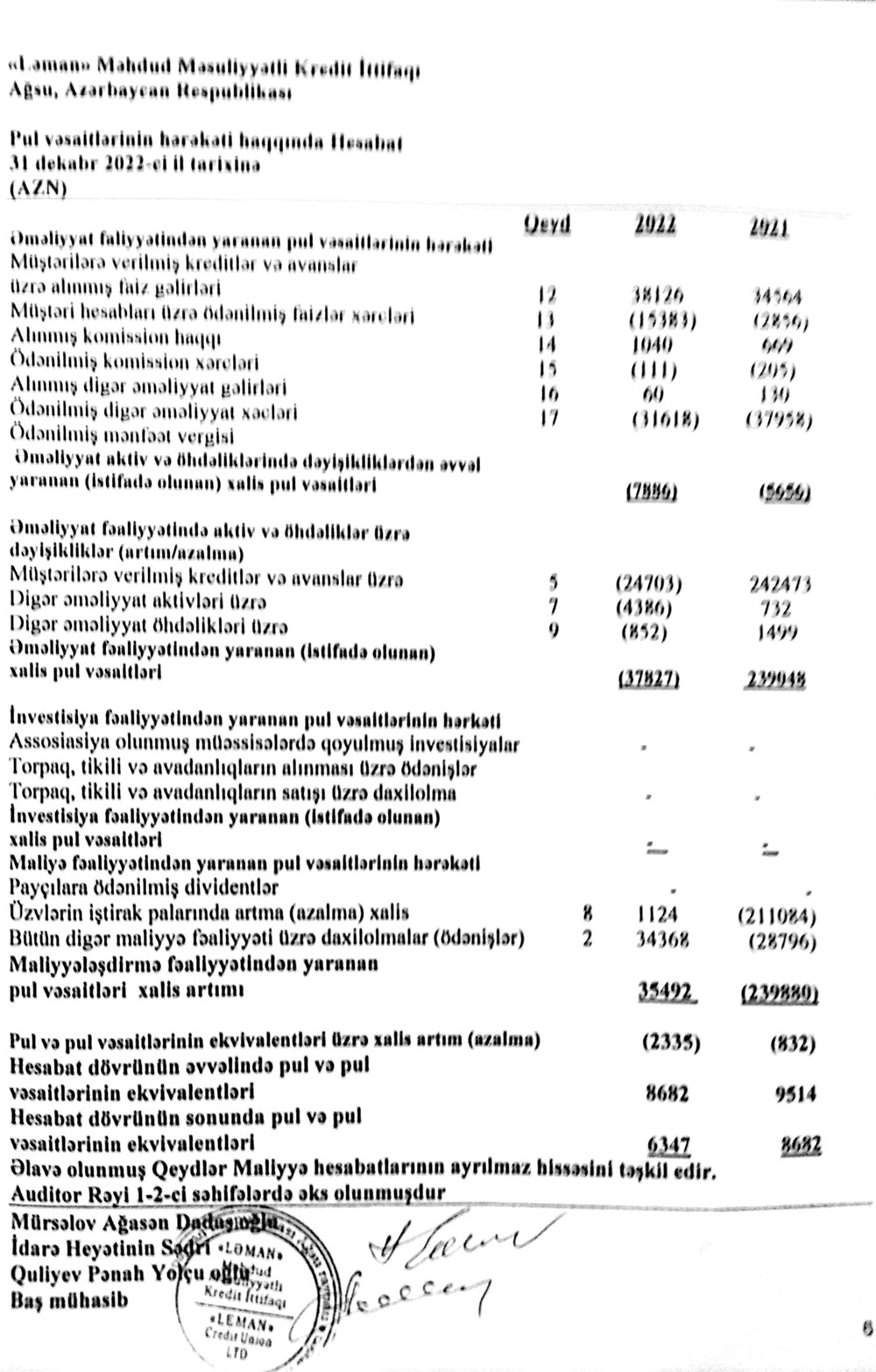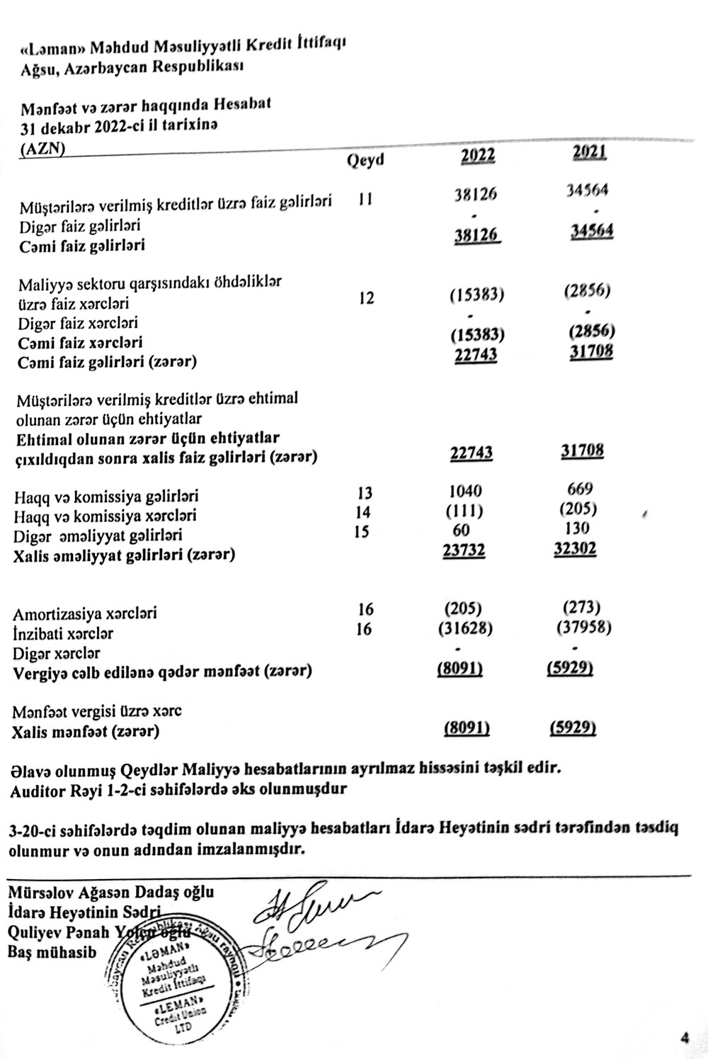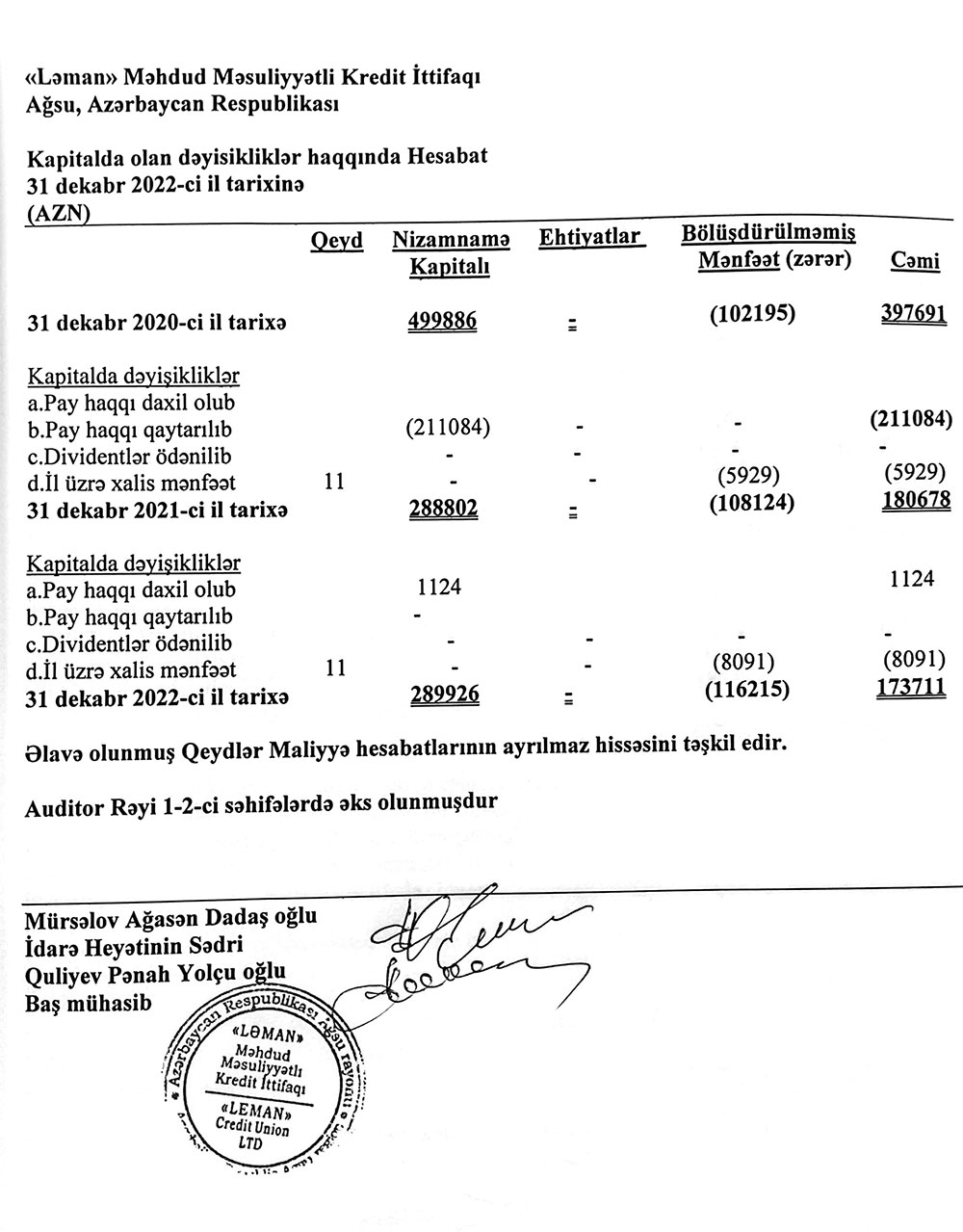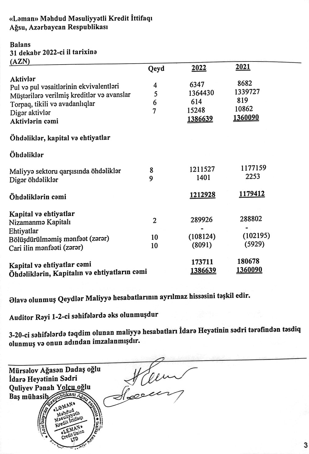Ağsu rayonunda fəaliyyət göstərən "Ləman" Məhdud Məsuliyyətli Kredit İttifaqı 31 dekabr 2022-ci il tarixinə maliyyə göstəriciləri: