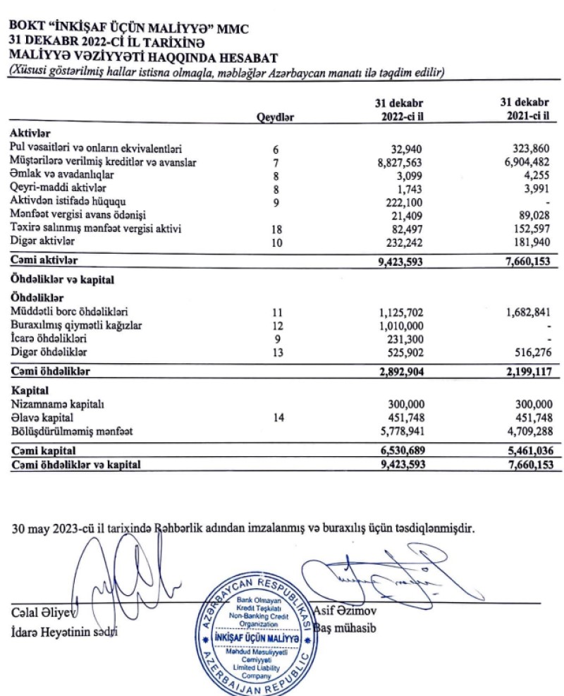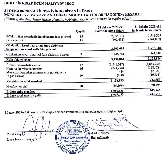 BOKT "İnkişaf Üçün Maliyyə" MMC 2022-ci ili 1 milyon 70 min manat xalis mənfəət ilə başa vurub. Təşkilat 2021-ci ili 244 min manat xalis mənfəət ilə bağlamışdı. Beləliklə, ötən il "İnkişaf Üçün Maliyyə"nin xalis mənfəəti 4,4 dəfə artıb.