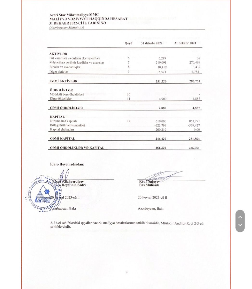 Ötən il "Azəri Star Mikromaliyyə BOKT"ın kredit portfeli (müştərilərə verilmiş cəmi kreditlər) 2021-ci ilin sonundakı 270 min manatdan 219 min manata geriləyib.