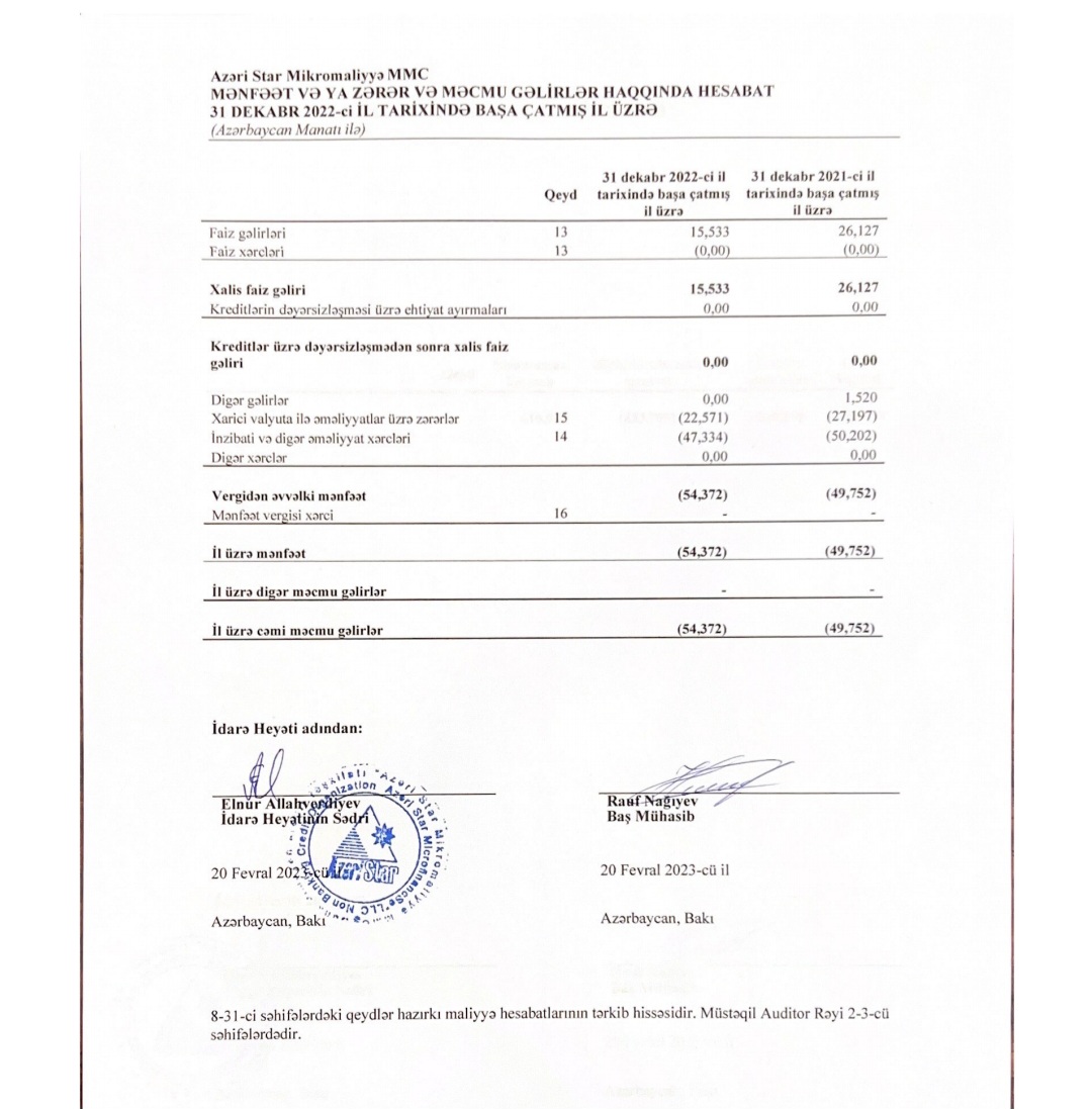 "Azəri Star Mikromaliyyə BOKT" MMC 2022-ci ili 54 min manat xalis zərər ilə başa vurub. Təşkilat 2021-ci ili 50 min manat xalis zərər ilə bağıamışdı.