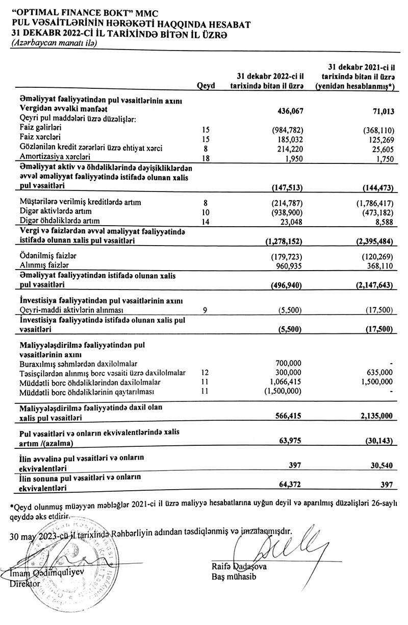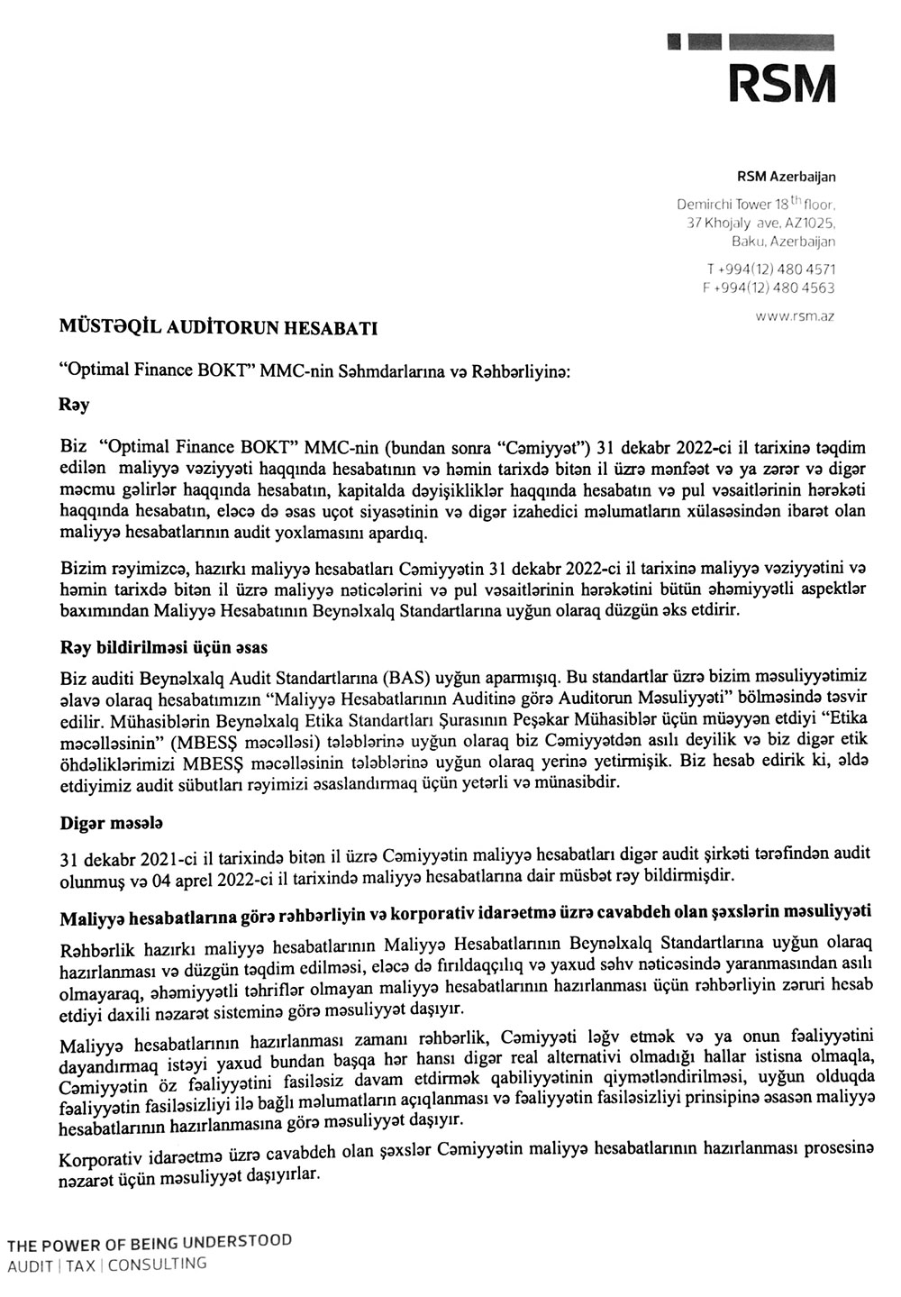 Azərbaycan Respublikasının Mərkəzi Bankı tərəfindən 29 dekabr 2020-ci il tarixdə verilmiş BKT-37 nömrəli lisenziya əsasında fəaliyyət göstərən “Optimal Finance Bank Olmayan Kredit Təşkilatı” Məhdud Məsuliyyətli Cəmiyyətinin 2022-ci il üçün kənar auditor tərəfindən təsdiqlənmiş illik maliyyə hesabatı ilə aşağıda tanış ola bilərsiniz.