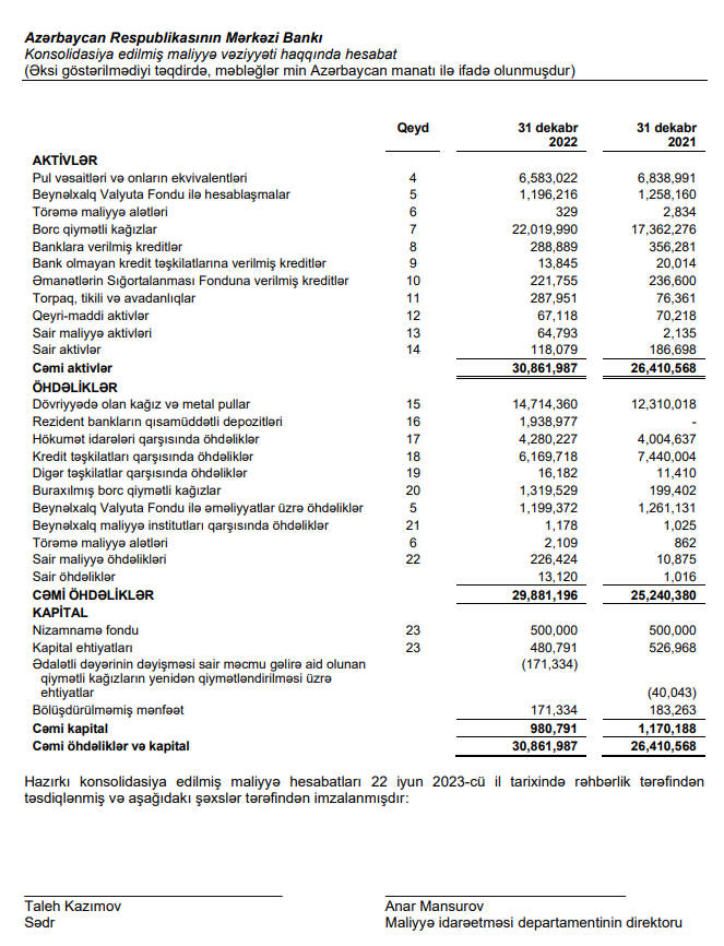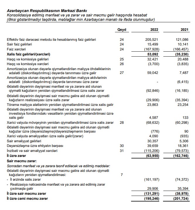 Marja.az bu barədə 31 dekabr 2022-ci il tarixinə Azərbaycan Respublikasının Mərkəzi Bankının Konsolidasiya Edilmiş Maliyyə Hesabatlarına istinadən xəbər verir.