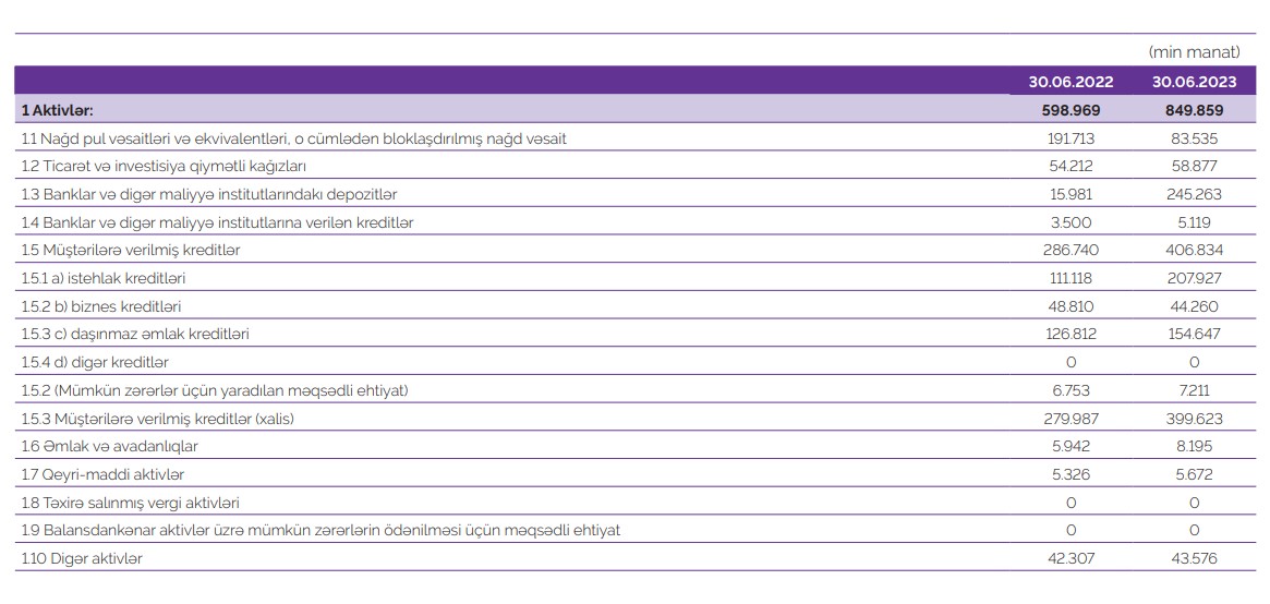 "Azər Türk Bank"ın cəmi aktivləri ötən ilin sonu ilə müqayisədə cari ilin ilk 6 ayı ərzində 250 milyon 890 min manat və ya 41,9% artaraq 30 iyun 2023-cü il tarixində 849 milyon 859 manat təşkil edib. Bankın kredit portfeli (müştərilərə verilmiş kreditlər) isə 120 milyon 94 min manat və ya 41,9% artaraq 406 milyon 834 manata çatıb. O cümlədən, istehlak kreditləri portfeli 87,1% və ya 96 milyon 809 min manat artaraq 207 milyon 927 min manata, ipoteka kreditləri portfeli 22% və ya 27 milyon 835 min manat artaraq 154 milyon 647 min manata yüksəlib, biznes kreditləri portfeli isə 9,3% və ya 4 milyon 550 min manat azalaraq 44 milyon 260 min manata düşüb.