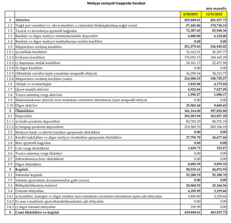 Müqayisə üçün qeyd edək ki, 2022-ci ilin 1-ci yarısında "Yapı Kredi Bank Azərbaycan"ın əməliyyat mənfəəti 4 milyon 488 min manat təşkil etmişdi.Beləlikl, bankın xalis mənfəətinin artması ehtiyat hesabına deyil, əməliyyat gəlirlərindən qaynaqlanır.