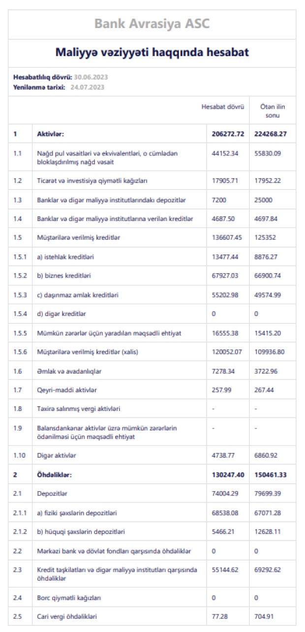 "Bank Avrasiya"da depozitlər 2023-cü ilin birinci yarısında 2022-ci ilin sonu ilə müqayisədə 5 milyon 695 min manat və ya 7,1% azalaraq 74 milyon 4 min manata düşüb.Bankda fiziki şəxslərin depozitləri artıb, hüquqi şəxslərin depozitləri isə azalıb.