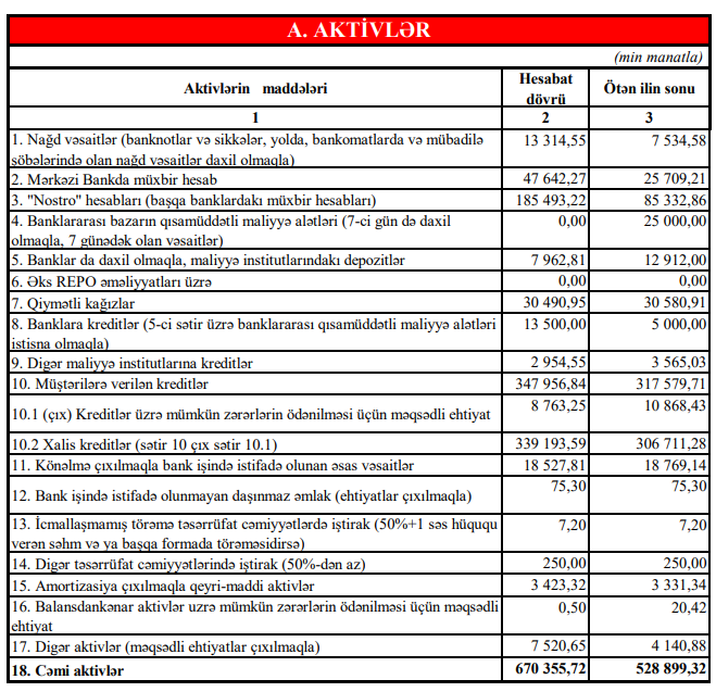 "Ziraat Bank Azərbaycan"ın cəmi aktivləri ötən ilin sonu ilə müqayisədə 2023-cü ilin birinci yarısında 141 milyon 456 min manat və ya 26,7% artaraq 30 iyun 2023-cü il tarixində 670 milyon 356 min manat təşkil edib.