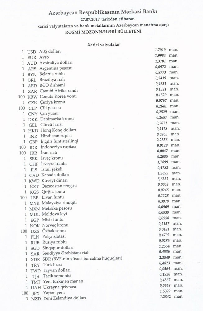İyulun 27-nə Mərkəzi Bankın açıqladığı rəsmi Dollar/manat məzənnəsi İyulun 26-sı ilə müqayisədə dəyişməyərək 1,7010 manat olub, Avro/manat məzənnəsi isə 1.9984 manata qalxıb.