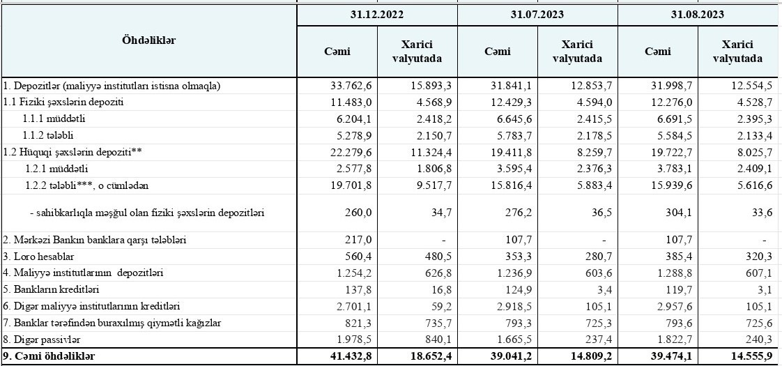 2023-cü ilin 8 ayı ərzində (yanavr-avqust) fiziki şəxslərin müddətli əmanətləri 487,4 milyon manat, tələbli əmanətləri isə 305,7 milyon manat artıb.