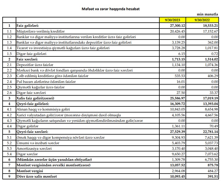 Bankın yaydığı press-relizdə bildirilir ki, ötən ilin uyğun dövrü ilə müqayisədə bankın xalis mənfəəti kəskin artaraq 10 milyon manat təşkil edib.