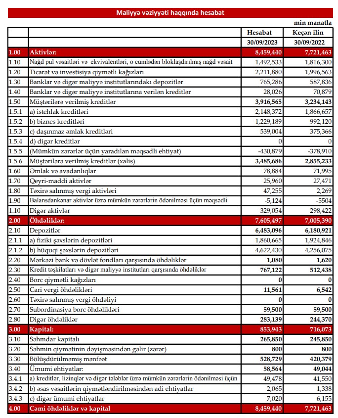 Bankın müştərilərə verdiyi kreditlər (kredit portfeli) ötən ilin 9 ayının yekunu ilə müqayisədə 682 milyon 422 min manat artaraq 30 sentyabr 2023-cü il tarixində 3 milyard 916 milyon 565 min manata çatıb. O cümlədən, Bankın istehlak kreditləri portfeli 281 milyon 715 min manat artaraq 2 milyard 148 milyon 372 min manata, biznes kreditləri portfeli 237 milyon 69 min manat artaraq 1 milyard 229 milyon 189 min manata, ipoteka kreditləri portfeli isə 163 milyon 638 min manat artaraq 539 milyon 4 min manata yüksəlib.