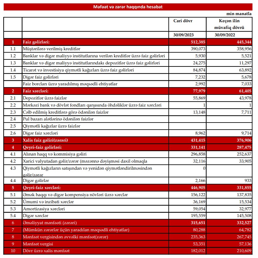 "Kapital Bank" ASC 2023-cü ilin 9 ayını 182 milyon 12 min manat xalis mənfəət ilə başa vurub. Bank ötən ilin eyni dövrünü 210 milyon 609 min manat xalis mənfəət ilə bağlamışdı. Xalis mənfəətin azalması xərclərin gəlirlərdən daha çox artması və mümkün zərərlər üçün yaradılan məqsədli ehtiyatlara daha çox vəsait ayrılması ilə əlaqədardır.