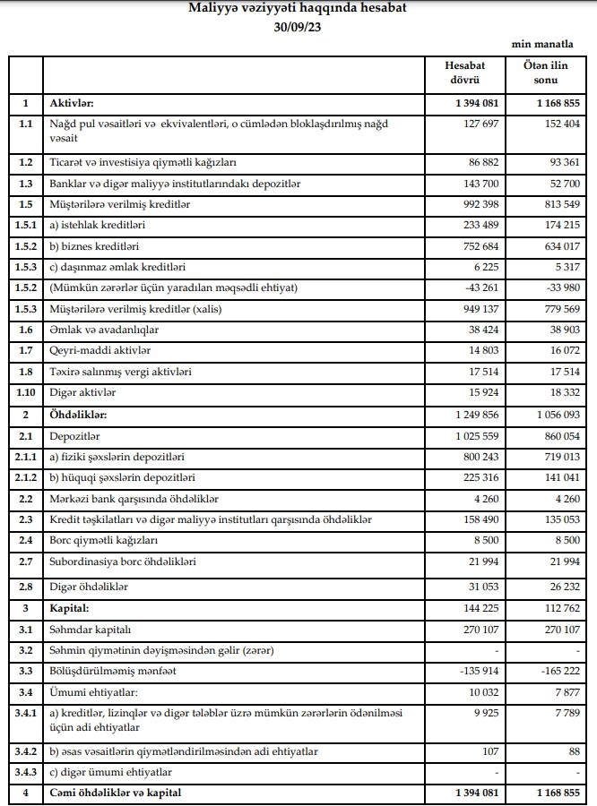 "AccessBank"ın cəmi aktivləri 2023-cü ilin 9 ayında ötən ilin sonu ilə müqayisədə 225 milyon 226 min manat artaraq 30 sentyabr 2023-cü il tarixində 1 milyard 394 milyon 81 min manat olub.