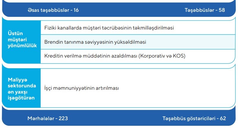 "Mobil tətbiqlərimizi yeni funksiyalarla təkmilləşdirməyi, rəqəmsal kanallarda korporativ əməliyyatları yüksəltməyi, yeni təcrübələrdən və data texnologiyalarından geniş istifadəni, müştəri mərkəzli alətlərin təqdim olunmasını planlaşdırırıq. Bu iddialı plan bankçılıq və innovasiyalar sahəsində böyük dəyişikliklər üçün zəmin yaradır".