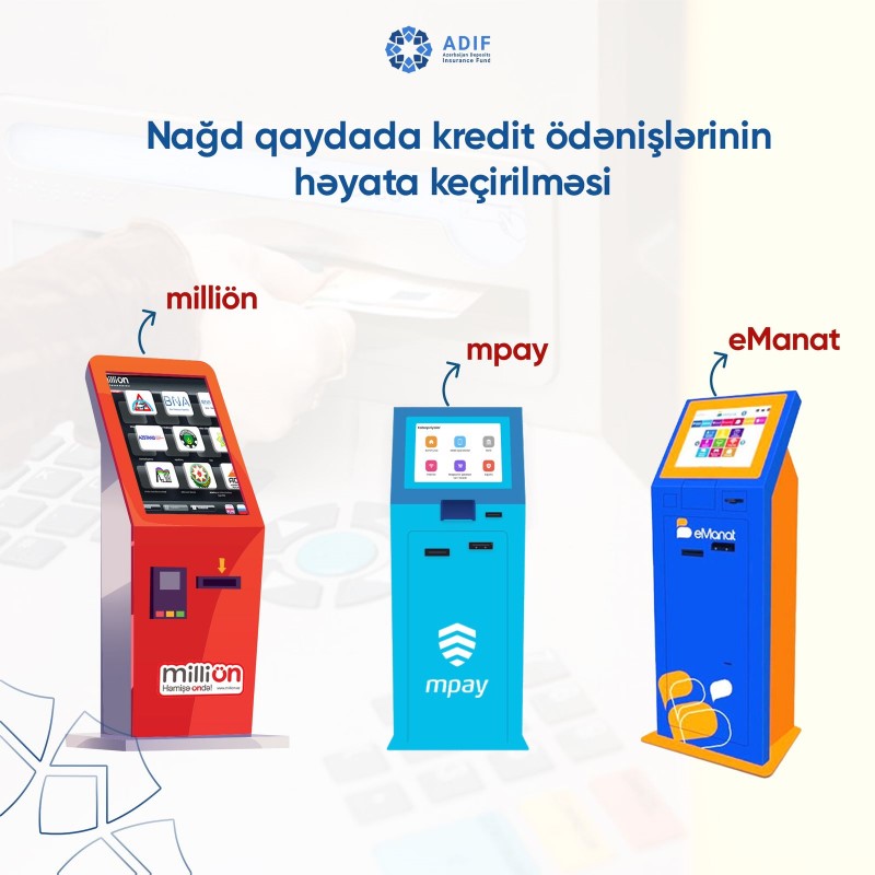 Nağd qaydada kredit ödənişlərinin həyata keçirilməsi – “e-manat”, “Million” və “m-pay” ödəniş köşkləri vasitəsilə;