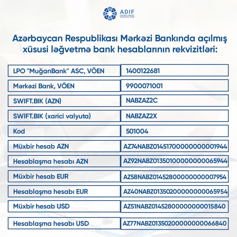 Köçürmə yolu ilə kredit ödənişlərinin həyata keçirilməsi üçün LPO “Muğanbank” ASC-nin Azərbaycan Respublikası Mərkəzi Bankında açılmış xüsusi ləğvetmə bank hesablarının rekvizitləri