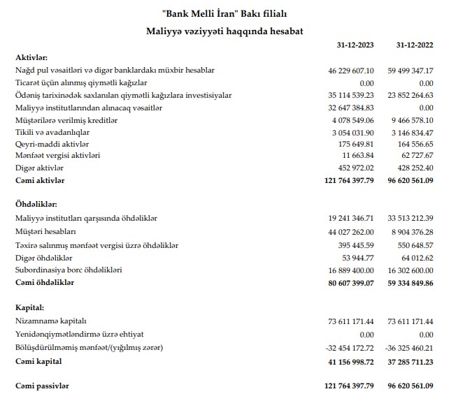 2023-cü ildə "Bank Melli İran" Bakı filialının kredit portfeli (müştərilərə verilmiş kreditlər) kəskin azalıb.