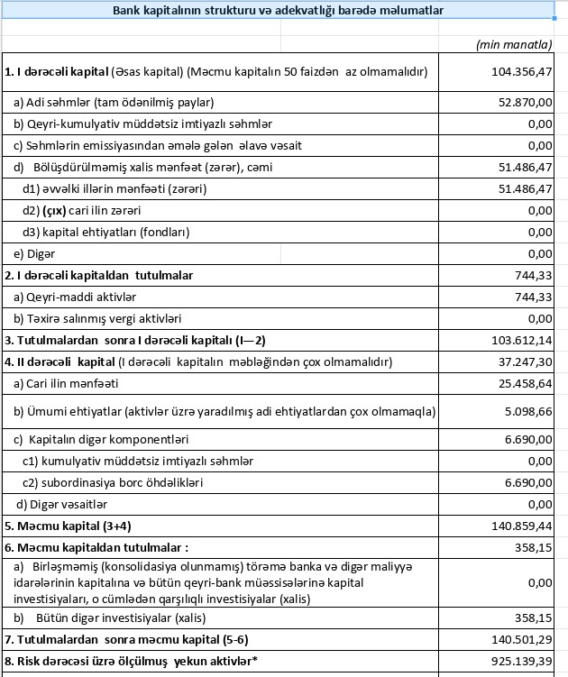 Müqayisə üçün qeyd edək ki, 2022-ci ildə "Bank of Baku"nın cəmi əməliyyat gəlirləri 111 milyon 874 min manat, cəmi əməliyyat xərcləri 77 milyon 776 min manat, əməliyyat mənfəəti 34 milyon 98 min manat, eyhiyatdan qayıdan məbləğ 12 milyon 103 min manat, ödənilən mənfəət vergisi 9 milyon 335 min manat təşkil etmişdi.