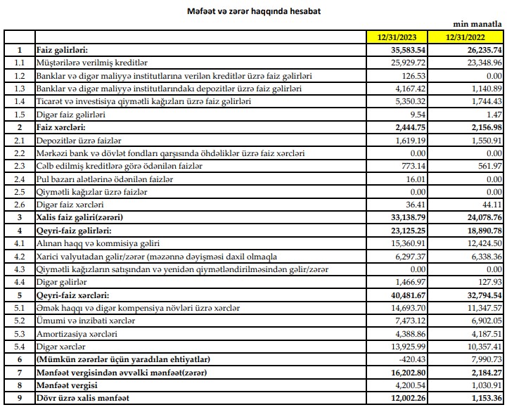 Müqayisə üçün qeyd edək ki, 2022-ci ildə "Yapı Kredi Bank Azərbaycan"ın cəmi əməliyyat gəlirləri 45 milyon 126 min manat, cəmi əməliyyat xərcləri 34 milyon 950 min manat, əməliyyat mənfəəti 10 milyon 176 min manat təşkil etmişdi. Bank əməliyyat mənfəətindən 7 milyon 991 min manat mümkün zərərlər üçün yaradılan ehtiyatlara ayırmış və 1 milyon 31 min manat mənfəət vergisi ödəmişdi.