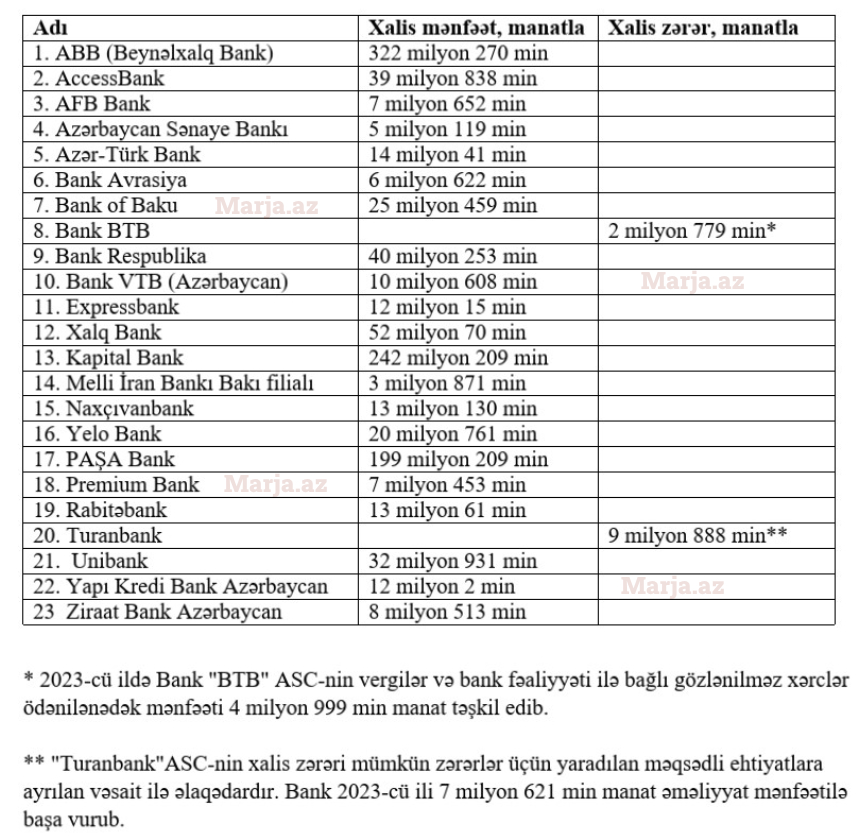 Marja.az xəbər verir ki, 2023-cü ili 23 bankdan 21-i xalis mənfəət ilə, 2-si xalis zərər ilə başa vurub.