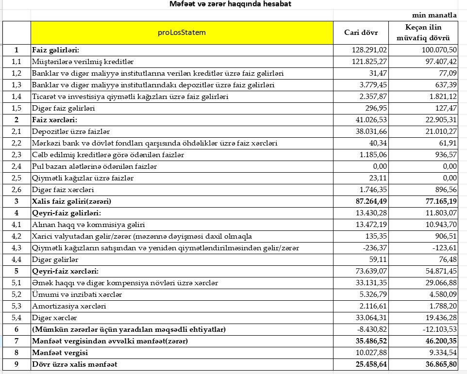 Müqayisə üçün qeyd edək ki, 2022-ci ildə "Bank of Baku"nın cəmi əməliyyat gəlirləri 111 milyon 874 min manat, cəmi əməliyyat xərcləri 77 milyon 776 min manat, əməliyyat mənfəəti 34 milyon 98 min manat, eyhiyatdan qayıdan məbləğ 12 milyon 103 min manat, ödənilən mənfəət vergisi 9 milyon 335 min manat təşkil etmişdi.