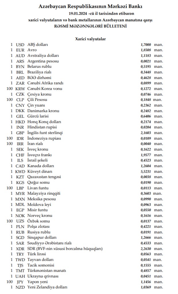 Rəsmi məzənnələr açıqlandı