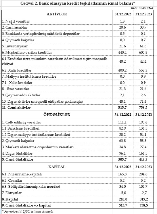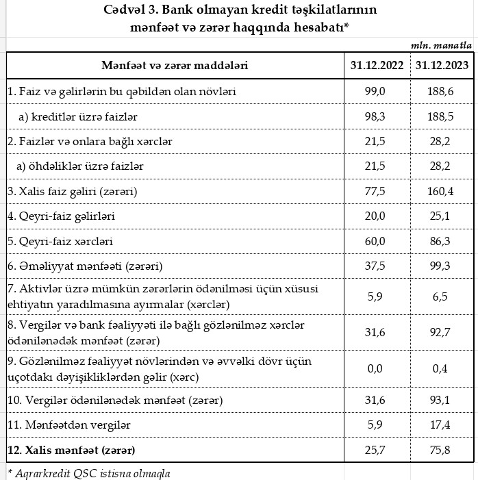 Ötən il bank olmayan kredit təşkilatları 99,3 milyn manat əməliyyat mənfəəti əldə ediblər (2022-ci ildə 37,5 milyon manat).
