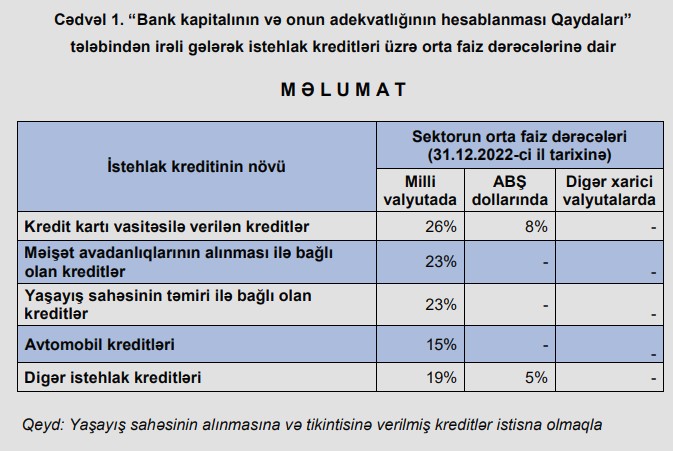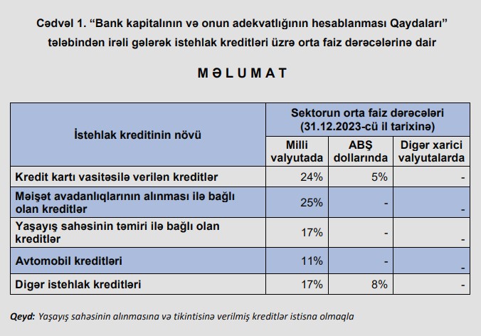 31 dekabr 2023-cü il tarixinə Azərbaycanın bank sektorunda istehlak kreditləri üzrə orta faiz dərəcələri açıqlanıb.