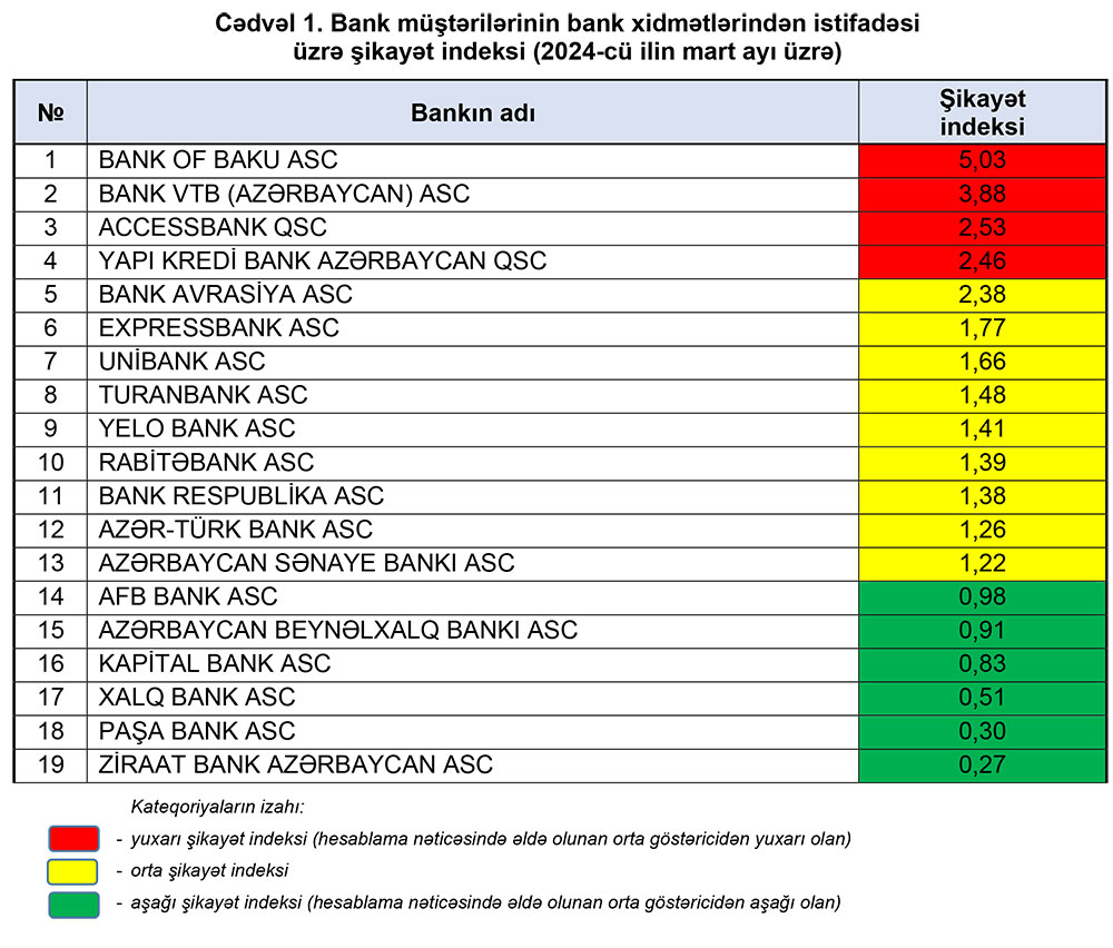 Bank xidmətlərindən istifadə üzrə şikayət indeksi açıqlanıb