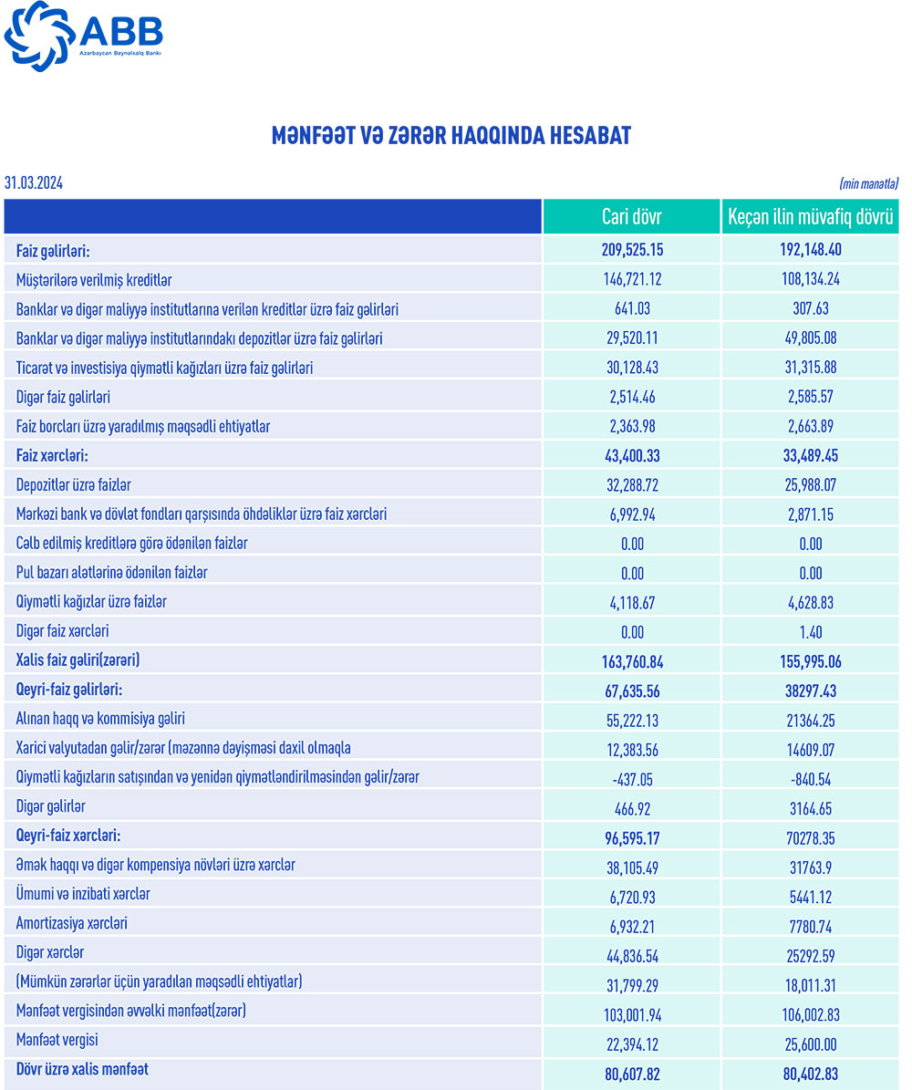 ABB (Azərbaycan Beynəlxalq Bankı) 2024-cü ilin 1-ci rübünü 80,6 milyon manat xalis mənfəətlə başa vurub.