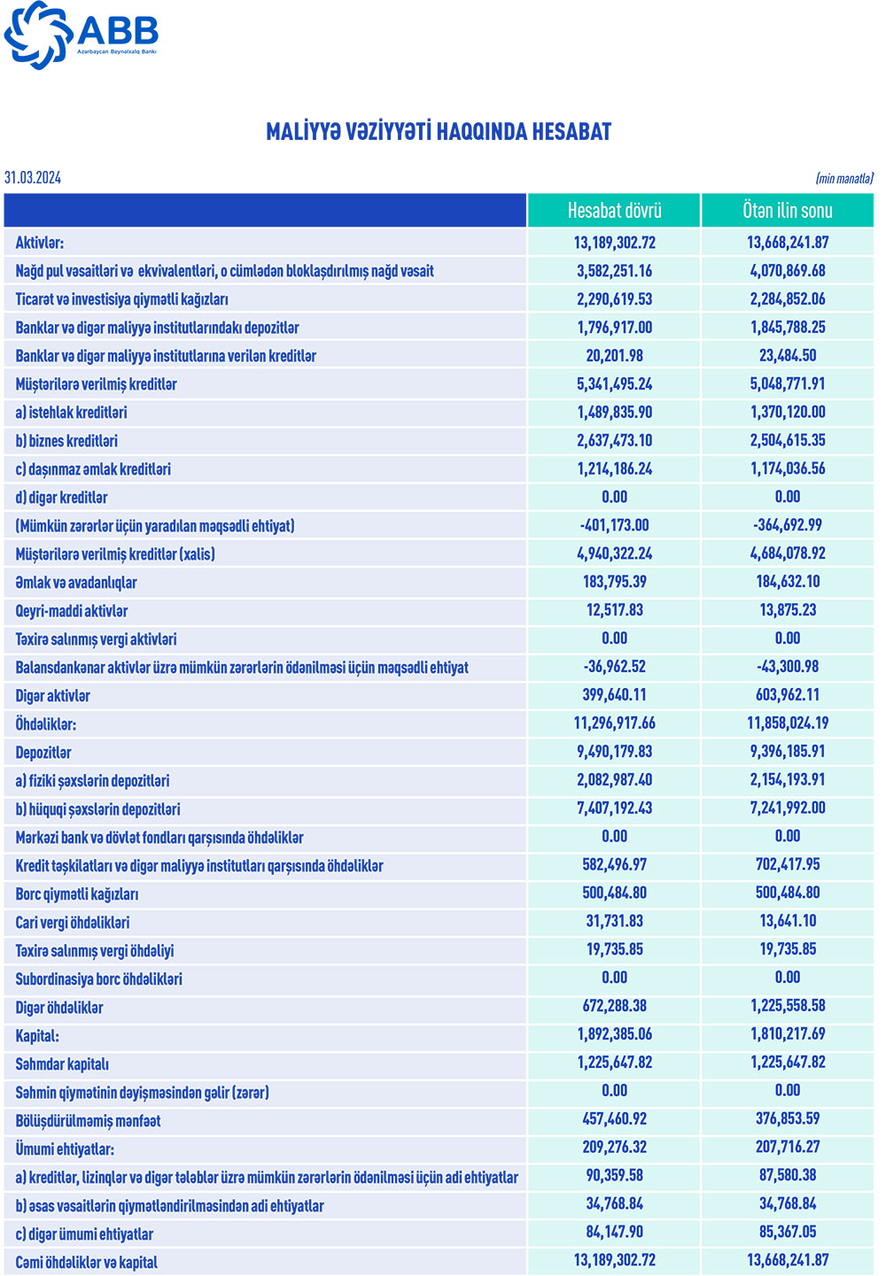 31 mart 2024-cü il tarixində ABB-nin cəmi aktivləri 13,2 milyard manat, öhdəlikləri isə 11,3 milyard manat olub.