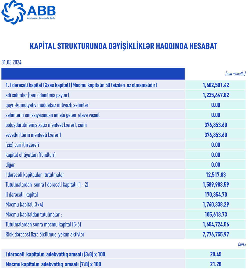 31 mart 2024-cü il tarixində ABB 1 milyard 654 milyon 724 min manat məcmu kapitala malik olub. İlk rüb ərzində ABB-nin I dərəcəli kapitalının adekvatlıq əmsalı 20.45%, məcmu kapitalının adekvatlıq əmsalı isə 21.28% təşkil edib. Bu göstəricilər tənzimləyici orqanın müəyyən etdiyi normalardan (müvafiq olaraq sistem əhəmiyyətli banklar üçün minimum 6% və 12%) əhəmiyyətli şəkildə yüksəkdir.