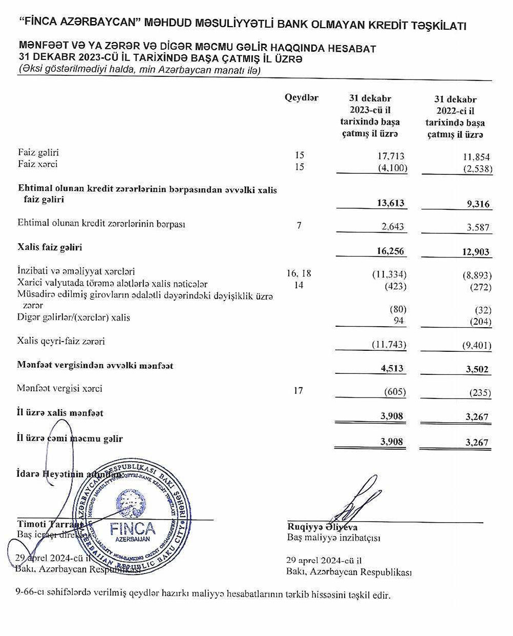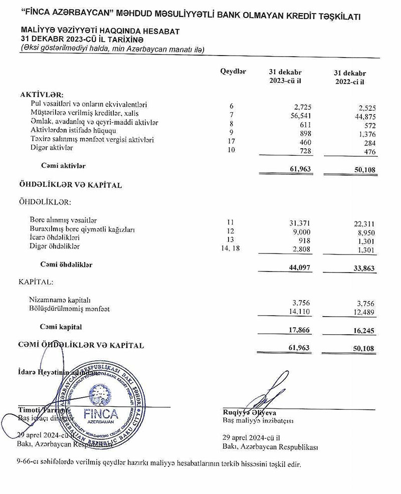 "Finca Azərbaycan" MMC Bank Olmayan Kredit Təşkilatı 2023-cü ili 3 milyon 908 min manat xalis mənfəət ilə başa vurub. Təşkilat 2022-ci ili 3 milyon 267 min manat xalis mənfəət ilə bağlamışdı. Beləliklə, ötən il "Finca Azərbaycan"ın xalis mənfəəti 641 min manat və ya 19,6% artıb.