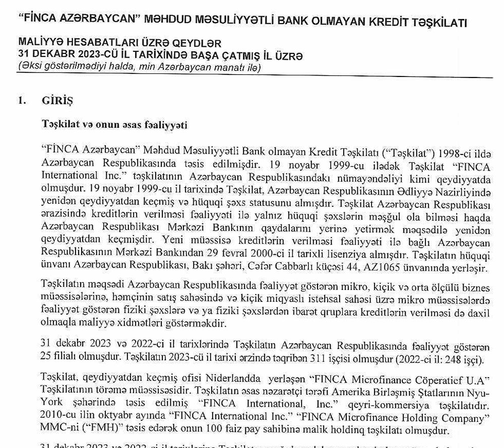 "Finca Azərbaycan" faiz gəlirini və xalis mənfəətini açıqladı