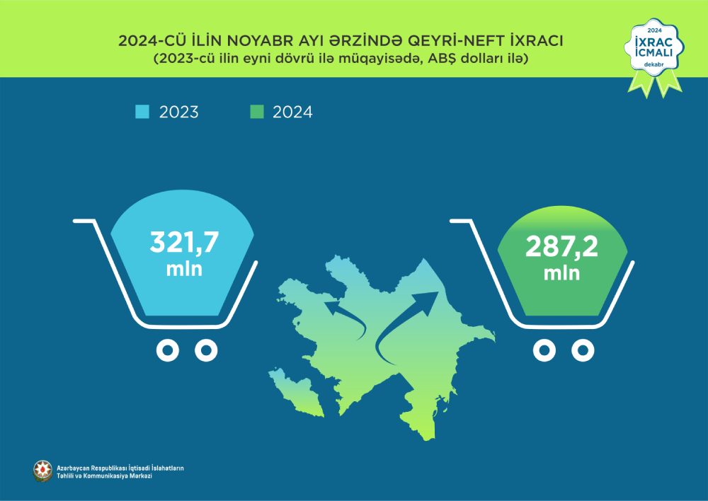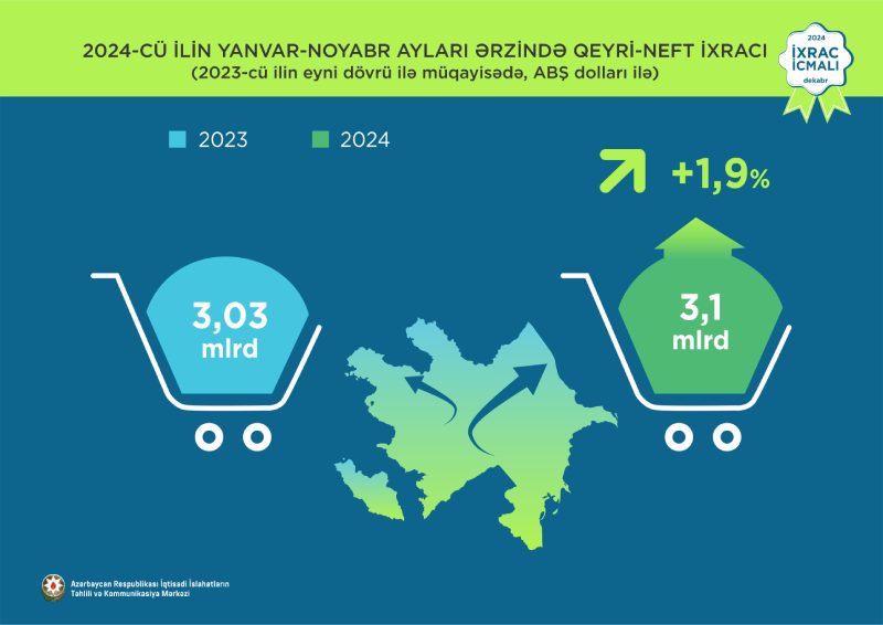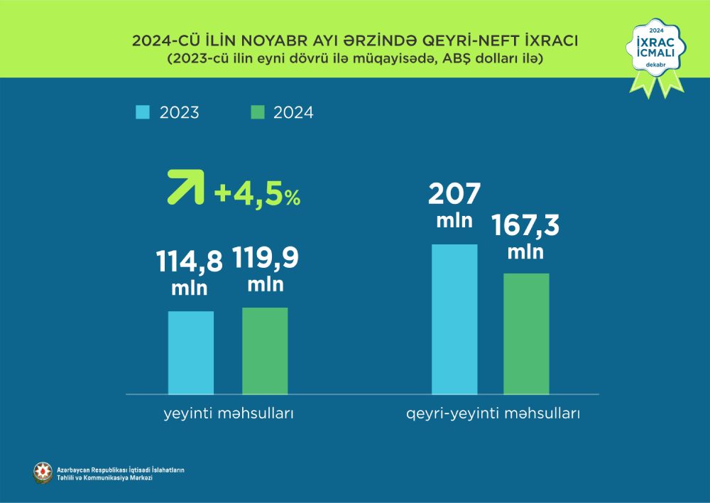 İcmala əsasən, 2024-cü ilin yanvar-noyabr ayları ərzində Azərbaycanın qeyri-neft-qaz ixracı 2023-cü ilin müvafiq dövrü ilə müqayisədə 1,9% artaraq 3,1 milyard ABŞ dolları təşkil edib. 2024-cü ilin yanvar-noyabr ayları ərzində yeyinti məhsulları 12,3% artaraq 923 milyon ABŞ dollarına bərabər olub.