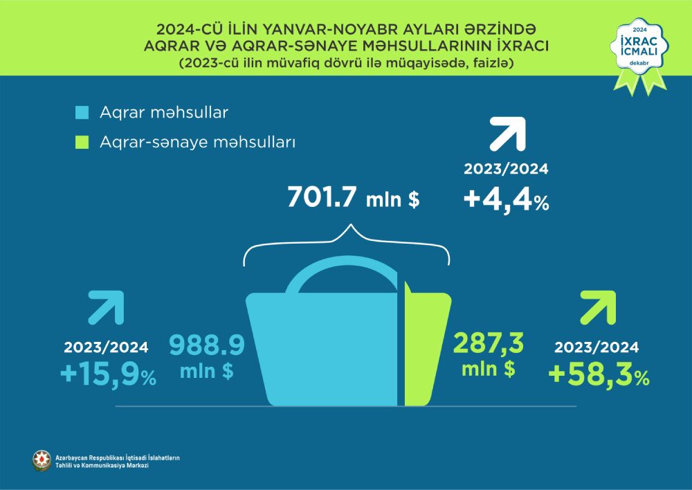2024-cü ilin yanvar-noyabr ayları ərzində aqrar məhsullar 4,4% artaraq 701,7 milyon ABŞ dolları, aqrar-sənaye məhsulları 58,3% artaraq 287,3 milyon ABŞ dollarına bərabər olub. Bütövlükdə aqrar və aqrar-sənaye məhsullarının birgə ixracı 15,9% artaraq 988,9 milyon ABŞ dolları təşkil edib.