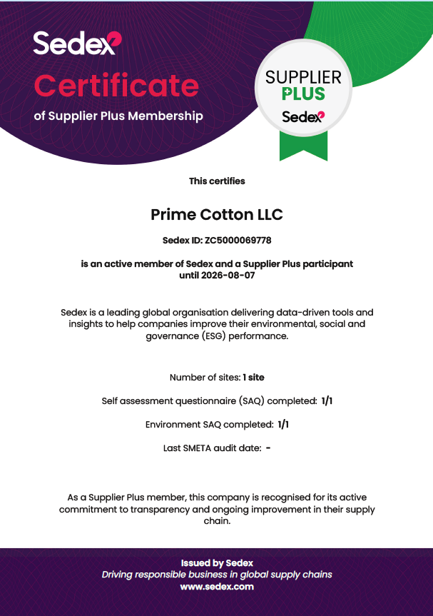 Prime Cotton-un beynəlxalq təşkilatlardan əldə etdiyi uğurlar bununla bitmir. Şirkət artıq Sedex- in Supplier Plus üzvü kimi qlobal təchizat zəncirində sosial, etik və ekoloji məsuliyyət prinsiplərinə əməl etdiyini rəsmi şəkildə təsdiqləyib. Eyni zamanda, Beynəlxalq Pambıq Assosiasiyası (ICA) üzvlüyü şirkətə beynəlxalq pambıq ticarətində etibarlılıq və şəffaflıq prinsiplərinə sadiqliyini nümayiş etdirmək imkanı verib.