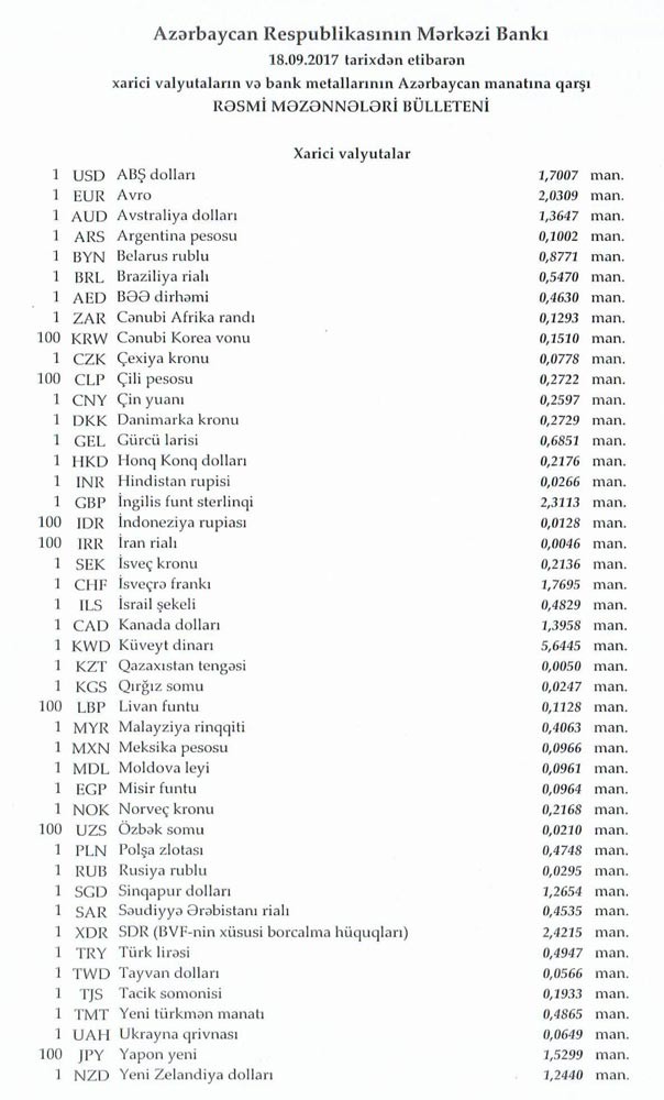 Sentyabrın 15-də rəsmi olaraq 1 dollar 1,7007 manata, 1 avro isə 2.0260 manata bərabər idi.