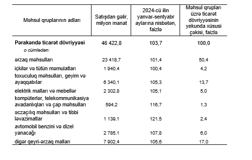 Qeyd edilib ki, 2025-ci ilin yanvar-sentyabr aylarında pərakəndə ticarət şəbəkəsində istehlakçılara 46 milyard 422,8 milyon manatlıq, o cümlədən 25 milyard 359,1 milyon manatlıq ərzaq məhsulları, içkilər və tütün məmulatları, 21 milyard 63,7 milyon manatlıq qeyri-ərzaq malları satılmışdır. 2024-cü ilin yanvar-sentyabr ayları ilə müqayisədə pərakəndə ticarət dövriyyəsi real ifadədə 3,7 faiz, o cümlədən ərzaq məhsulları, içkilər və tütün məmulatları üzrə 1,3 faiz, qeyri-ərzaq malları üzrə 6,8 faiz artmışdır.