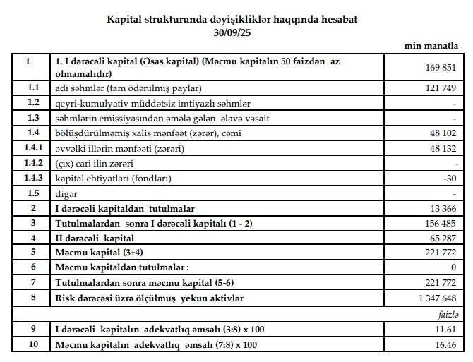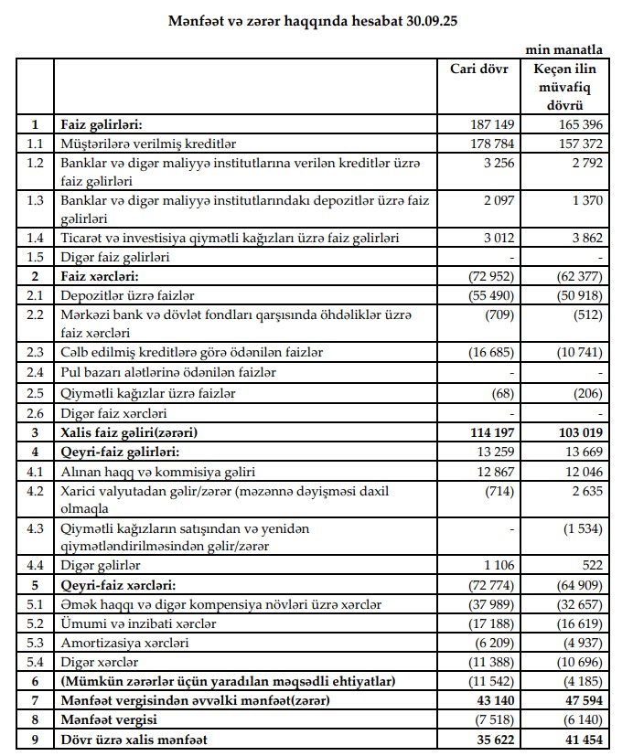 Bankın mümkün zərərlər üçün yaratdığı ehtiyatlar 2025-ci ilin 9 ayında 11 milyon 542 min manat olub ki, bu da ötən ilin eyni dövrü ilə müqayisədə 2,8 dəfə çoxdur (2024-cü ildə – 4 milyon 185 min manat). Bu amil də mənfəətin azalmasında əsas səbəblərdən biridir.